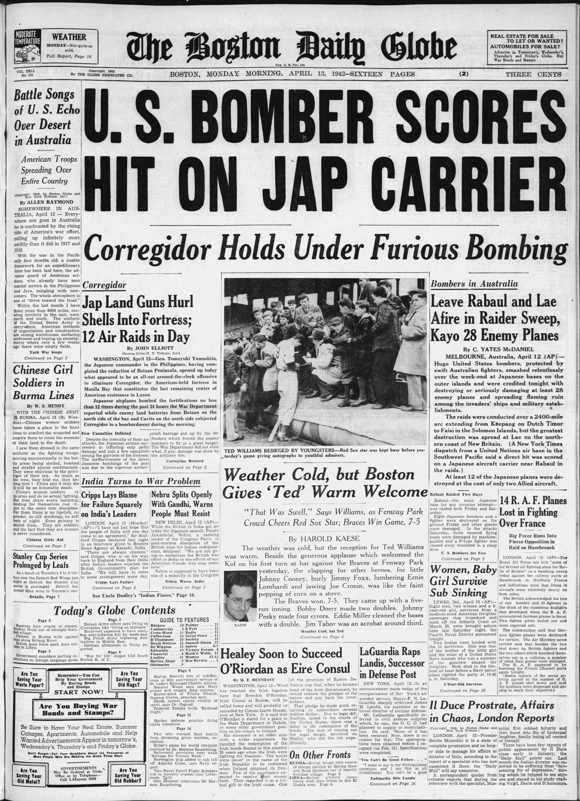 War, war, war but here's some sports for a change. Ted Williams is a pretty popular baseball player on the Boston Red Socks team. So much so he makes the front page. I'm thinking the guys in Battery H were fans.