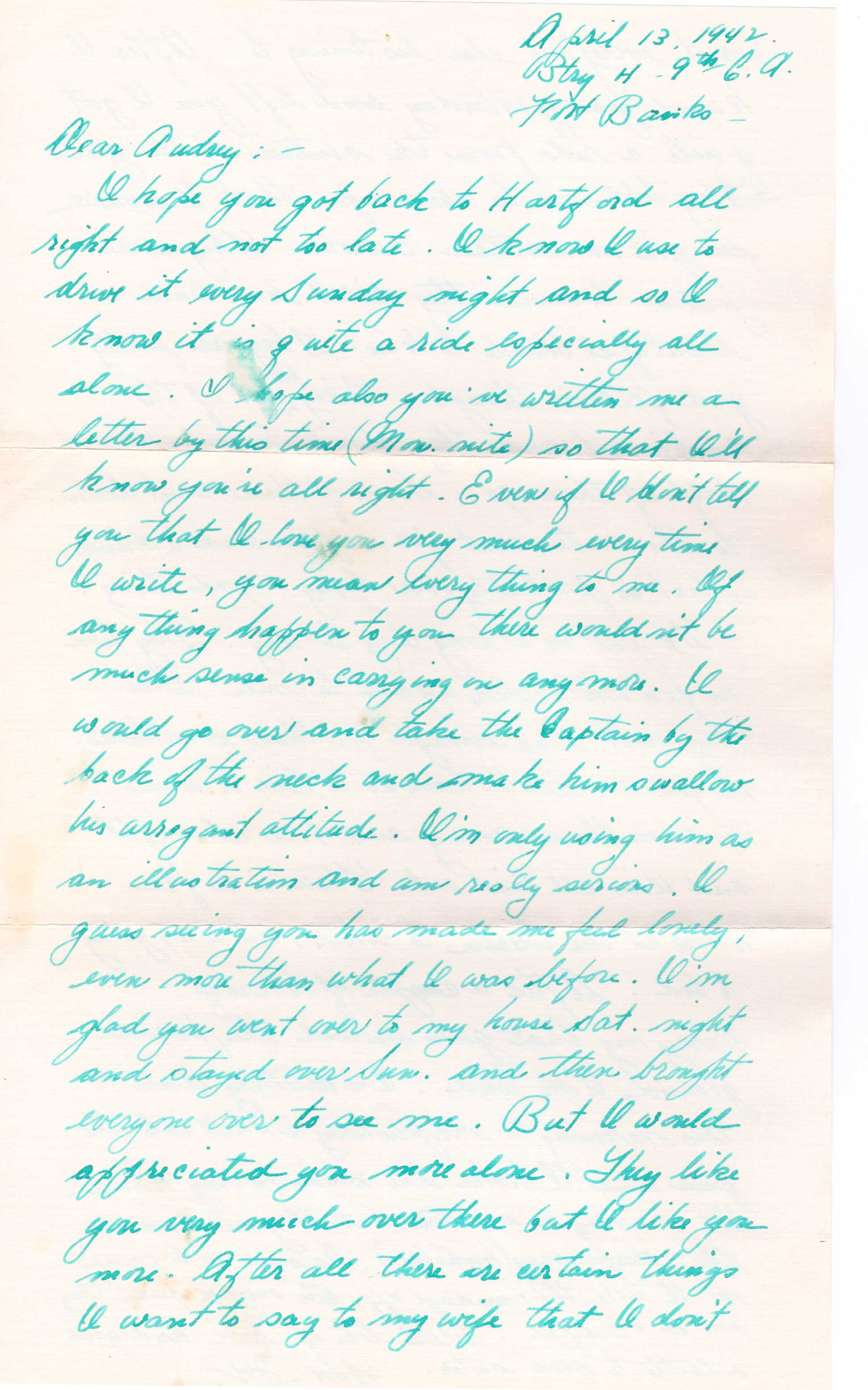 I hope you got back to Hartford alright and not too late. I know I used to drive it every Sunday night and so I know it is quite a ride, especially all alone. I hope also you've written me a letter by this time (Monday night) so that I'll know you're alright. Even if I didn't tell you that I love you very much every time I write, you mean everything to me. If anything happens to you, there wouldn't be much sense in carrying on anymore. I would go over and take the captain by the back of the neck and make him swallow his arrogant attitude. I'm only using him as an illustration and I'm really serious.