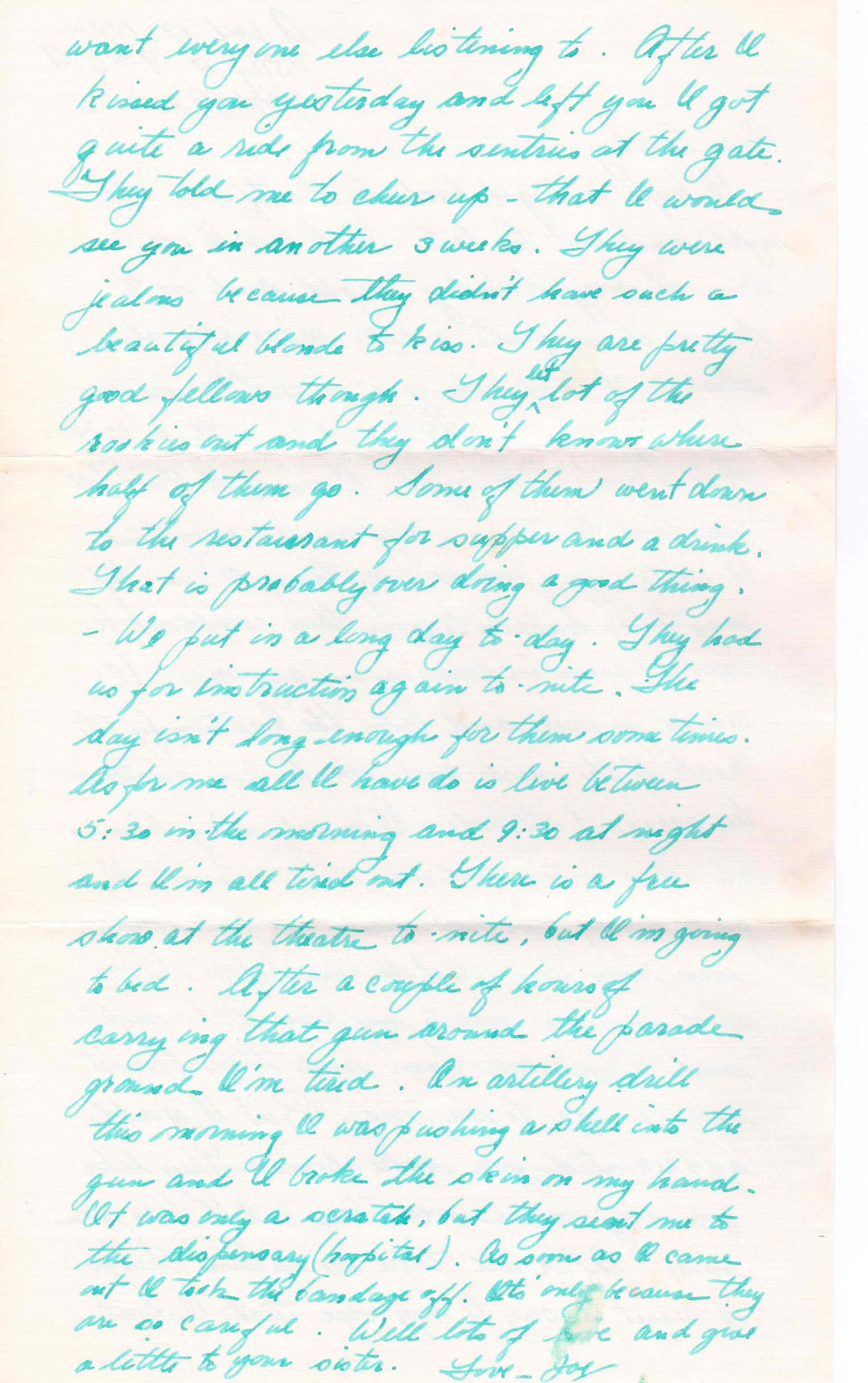 There is a free show at the theater tonight but I'm going to bed. After a couple hours of carrying that gun around the parade ground, I’m tired. At the artillery drill this morning I was pushing a shell into the gun that I broke the skin on my hand. It was only a scratch, but they sent me to the dispensary (hospital). As soon as I came out, I took the bandage off. It's only because they are so careful.