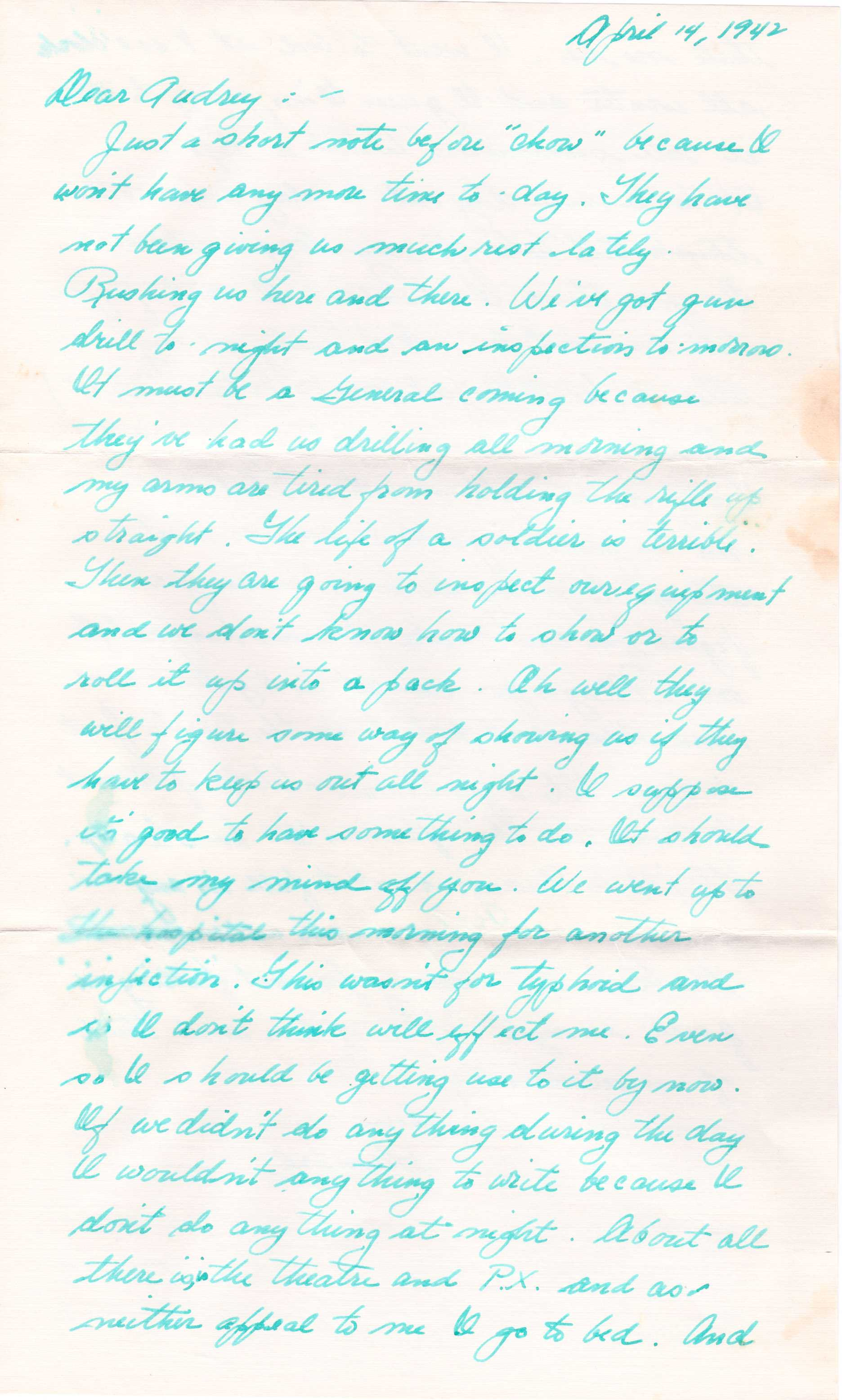 Just a short note before “chow” because I won't have any more time today. They have not been giving us much rest lately. Rushing us here and there. We've got gun drill tonight and some inspection tomorrow. It must be a general coming because they had us drilling all morning and my arms are tired from holding the rifle up straight. Then they are going to inspect our equipment and we don't know how to show or roll it up into a pack. Oh well, they will figure some way of showing us even if they keep us out all night. I suppose it's good to have something to do. It should take my mind off you.