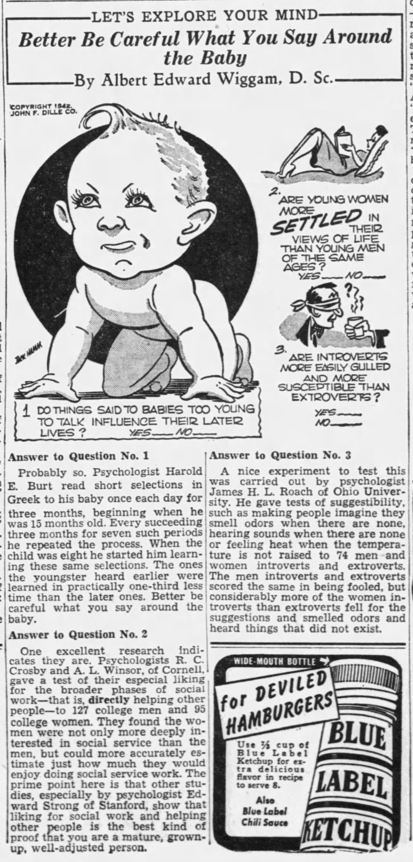 This is from the Globe on April 14, 1942 in the Women's section on page 18. So... answers to what babies hear or understand, are women better than men (yes), and who falls for the smell? Note that I have never made deviled hamburgers before. If you have, please explain what they are and how you make them.