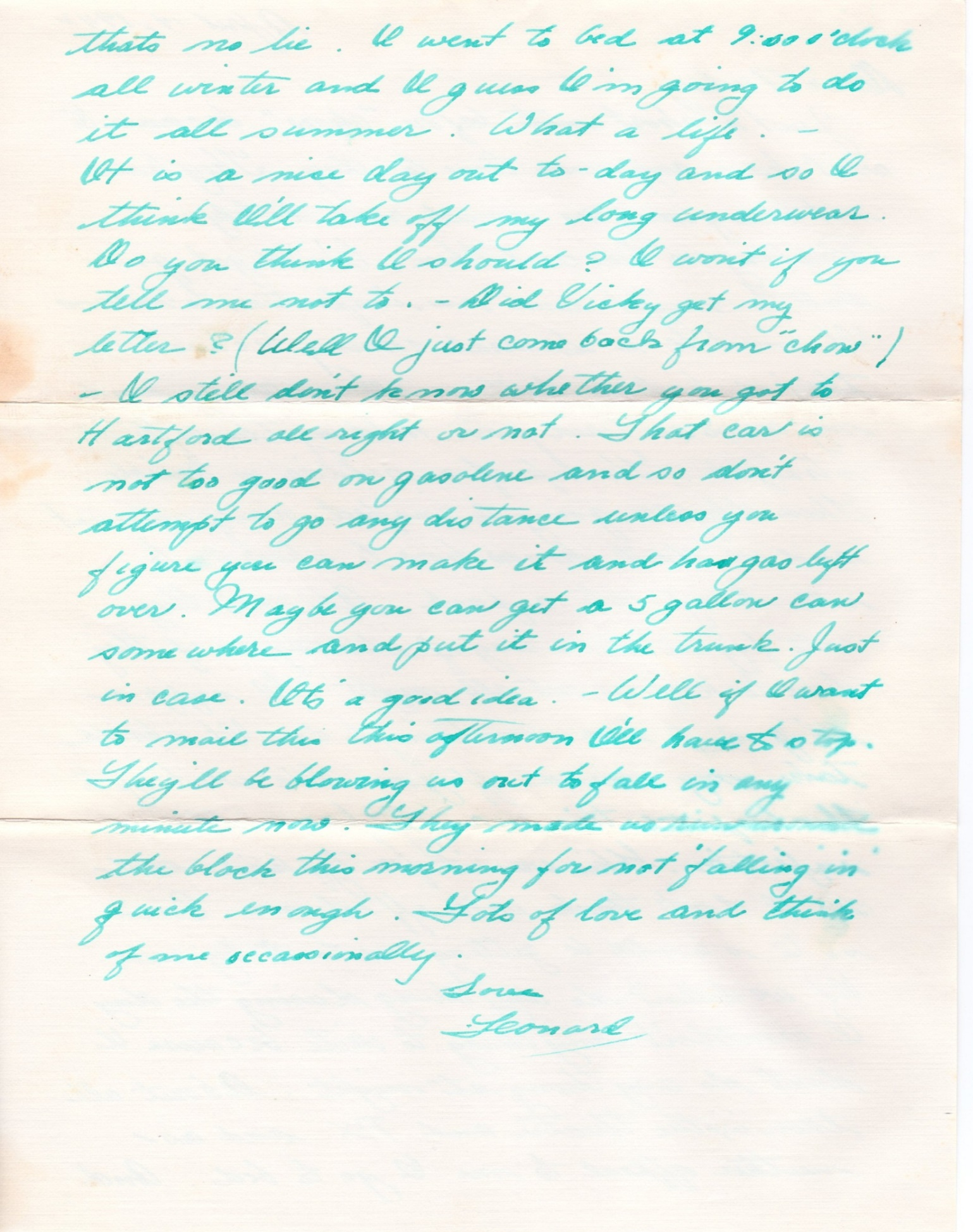 It is a nice day out today and so I think I'll take off my long underwear. Do you think I should? I won't if you tell me not to. Did Vicki get my letter? Well I just came back from chow I still don't know whether you got to Hartford all right or not. That car is not too good on gasoline and so don't attempt to go any distance unless you figure you can make it and have gas left over. Maybe you can get a 5-gallon can somewhere and put it in the trunk. Just in case. It’s a good idea.