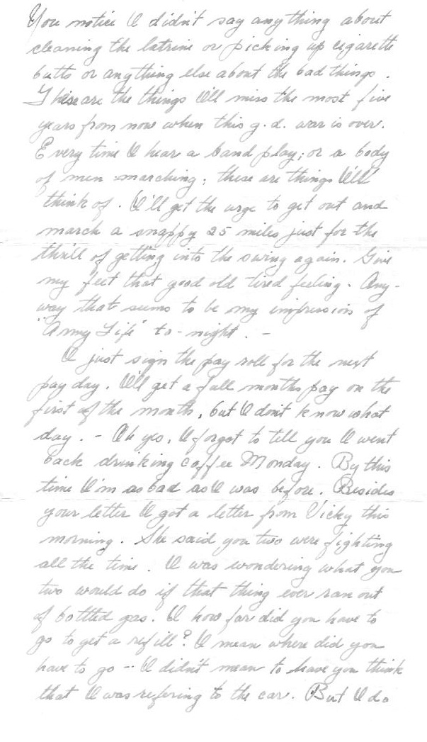 You notice I didn't say anything about cleaning the latrine or picking up cigarette butts or anything else about the bad things. These are the things I will miss the most five years from now when the g.d. war is over. Every time I hear a band play, or a body of men marching, these are the things I'll think of. I'll get the urge to get out and march a snappy 25 miles just to get into the swing again. Give my feet that good old tired feeling. Anyway, that seems to be my impression of army life tonight.