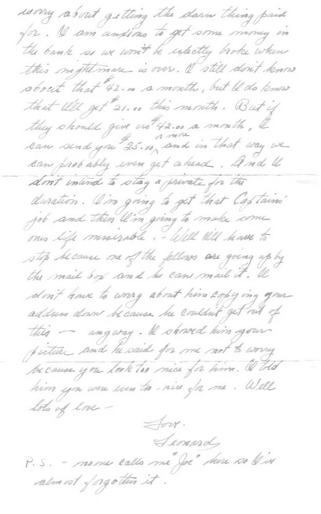 I still don't know about that $42 a month but I do know I'll get $21 this month. But if they should give us $42 a month, I can send you $25 or more and in that way we can probably even get ahead. And I don't intend to stay a private for the duration. I'm going to get that captain's job and then I’m going to make someone's life miserable.