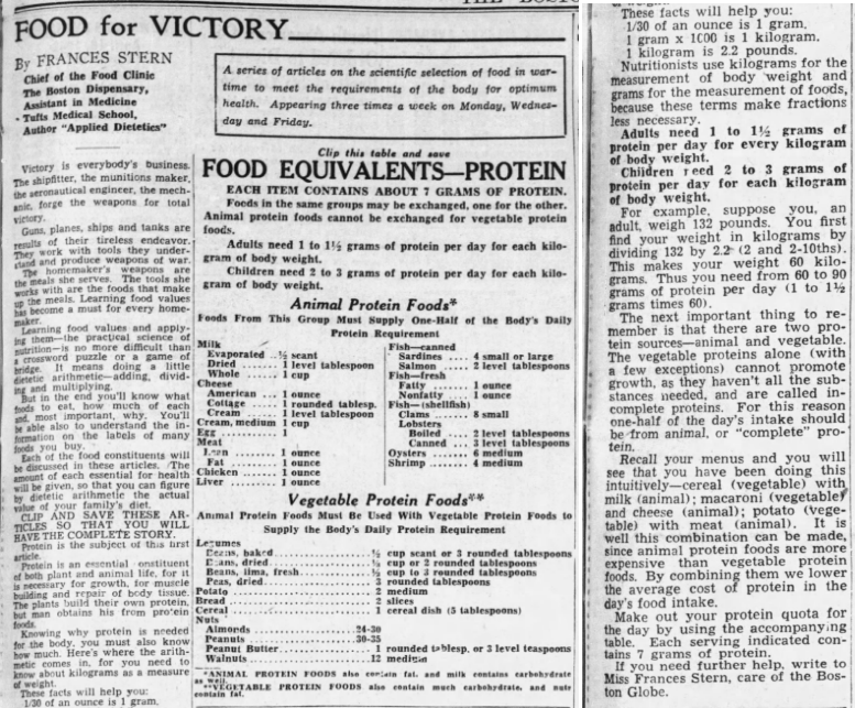 Yesterdays Globe announced this new series - Food for Victory. "The homemakers weapons are the meals she serves". It's just straight-forward, smart information about nutrition. I guess I would question whether macaroni is vegetable but other than that, this is pretty impressive. I bet if you write to Miss Frances Stern, she would respond to any question or query.