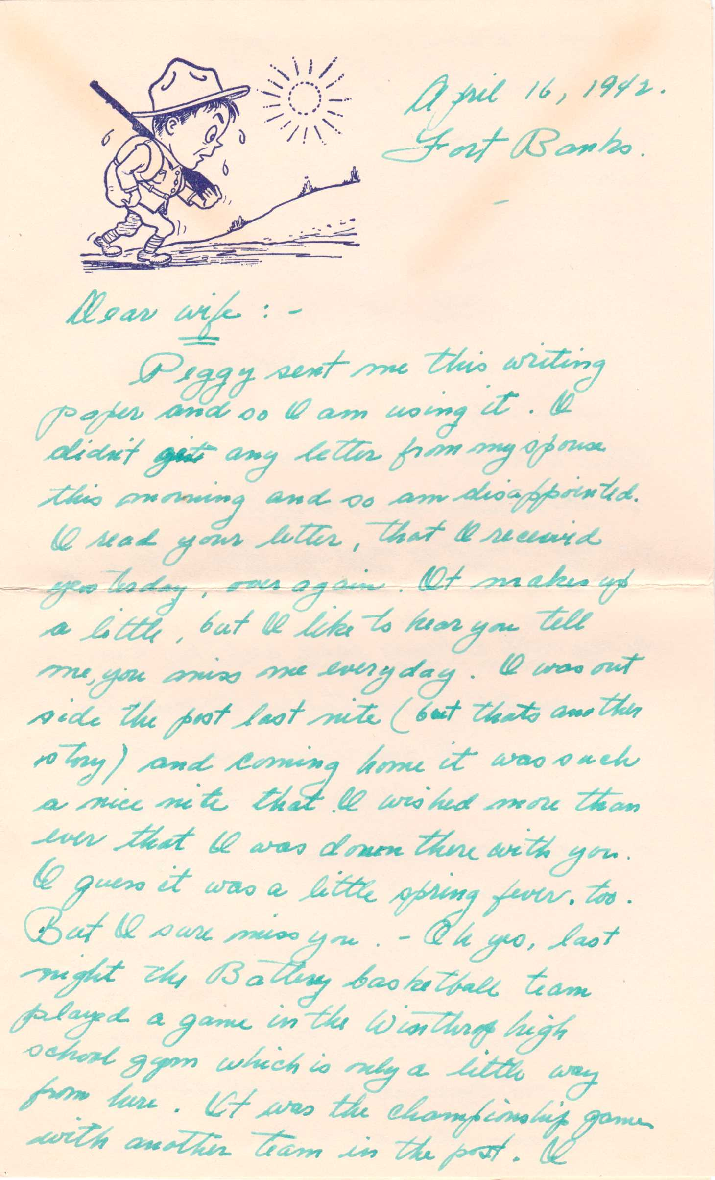 Peggy sent me this writing paper and so I'm using it. I didn't get any letter from my spouse this morning and so I am disappointed. I read your letter that I received yesterday over again. It makes up a little but I do like to hear you tell me you miss me every day. I was outside the post last night (but that's another story) and coming home it was such a nice night that I wished more than anything I was down there with you. I guess it was a little spring fever too. But I sure miss you.