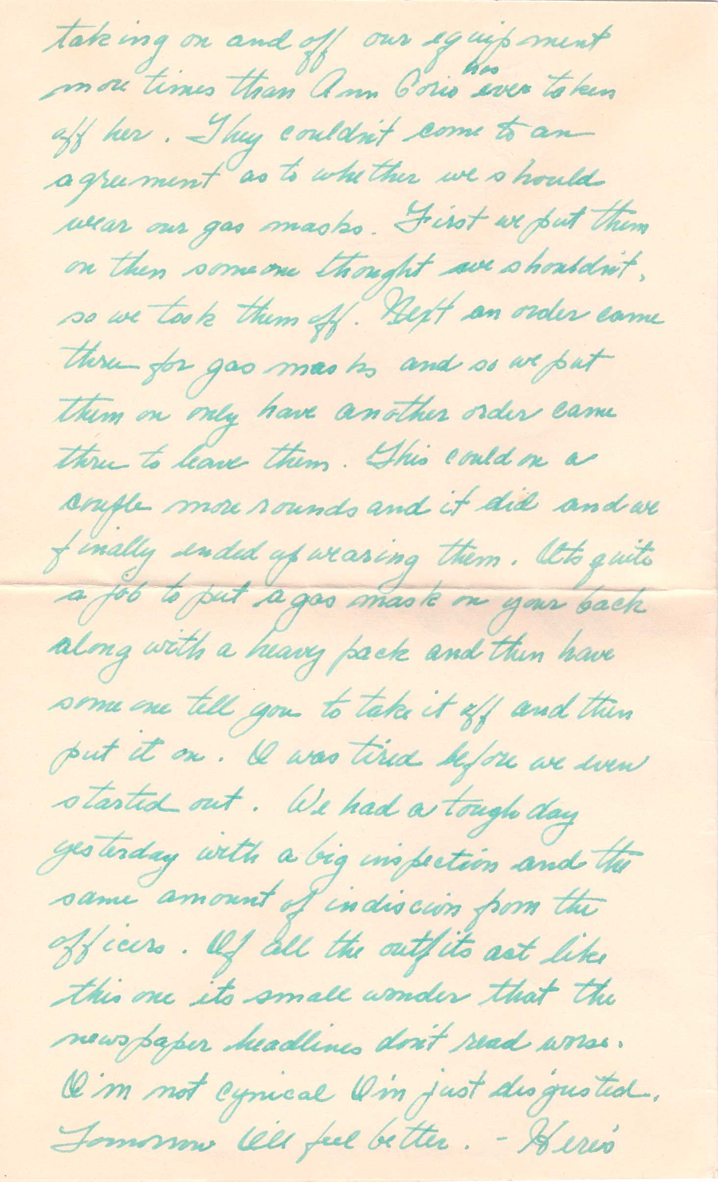 This morning they had us taking on and off our equipment more times than Ann Corio has ever taken off hers. They couldn’t come to an agreement as to whether we should wear our gas masks. First we put them on then someone thought we shouldn’t so we took them off. Next an order came through for gas masks and so we put them on only to have another order come through to leave them. This could have gone on a couple more rounds and it did and we finally ended up wearing them. It's quite a job to put a gas mask on your back along with a heavy pack and then to have someone tell you to take it off and then put it on. I was tired before we even started out.