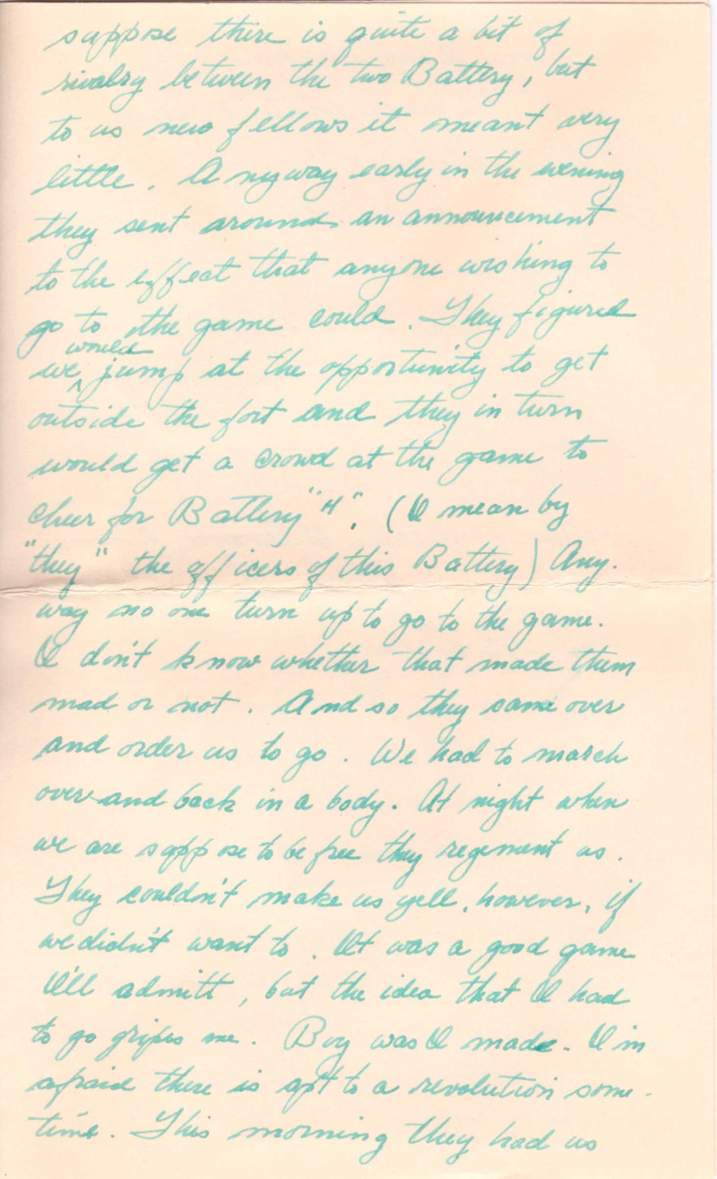 Oh yes, last night the battery basketball team played a game in the Winthrop high school gym (which is only a little ways from here) another team in the post. I suppose there is quite a bit of rivalry between the two Batteries, but to us new fellows it meant very little. Anyway, early in the evening they sent around an announcement to the effect that anyone wishing to go to the game could. They figured we would jump at the opportunity to get outside the base and they in turn would get a crowd at the game to cheer for battery H. (I mean by “they” the officers in this battery) Anyway no one turned up to go to the game. I don't know whether that made them mad or not. And so they came over and ordered us to go. We had to march over and back in a body - at night when we were supposed to be free they regimented us. They couldn't make us yell however if we didn't want to. It was a good game I’ll admit but the fact that I had to go gripes me. Boy was I mad. I'm afraid there is apt to be a revolution sometime.