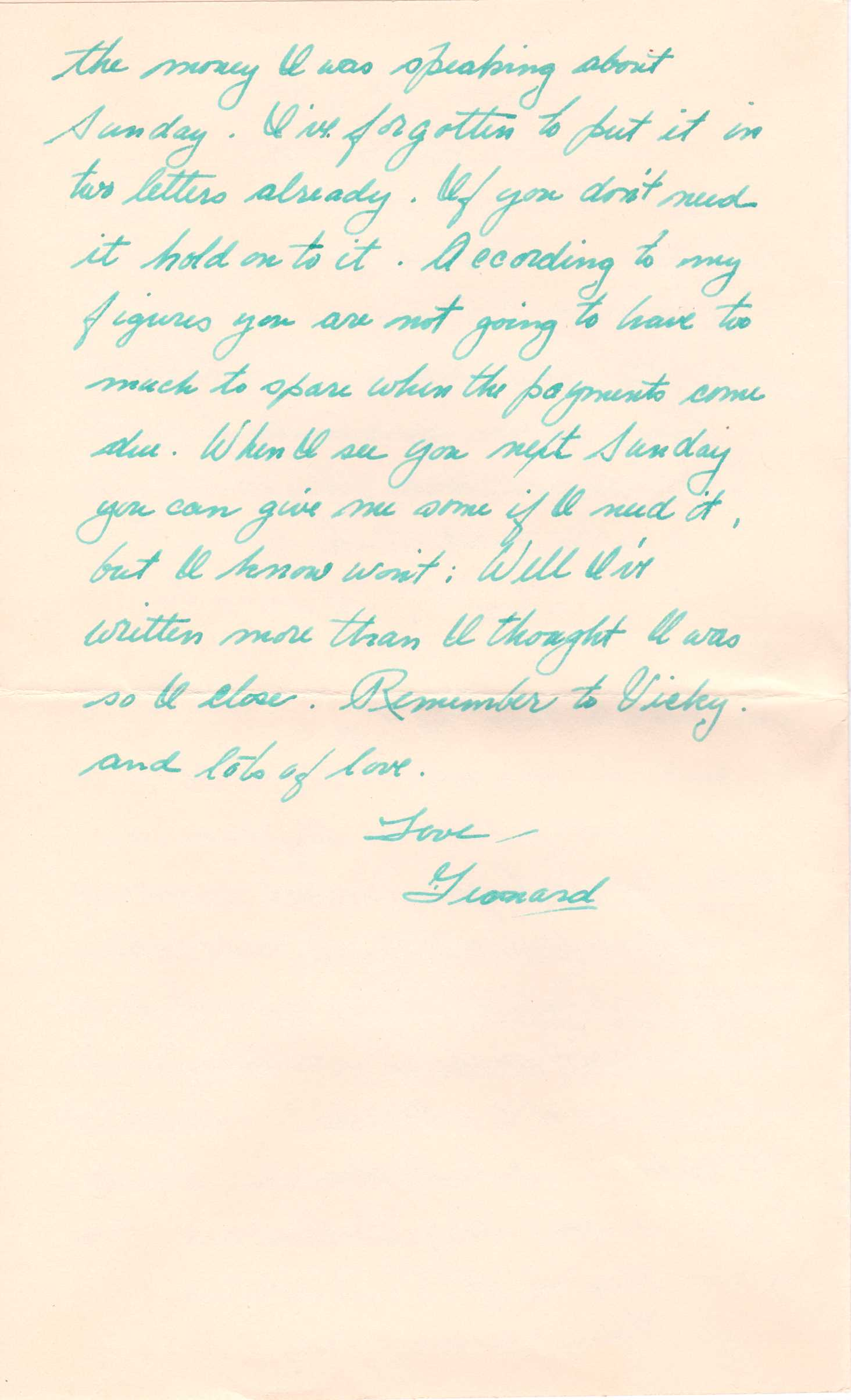 Here’s the money I was speaking about Sunday. I’ve forgotten to put it in two letters already. If you don't need it, hold on to it. According to my figures you are not going to have too much to spare when the payments come due. When I see you next Sunday you can give me some of it if I need it, but I know I won’t.