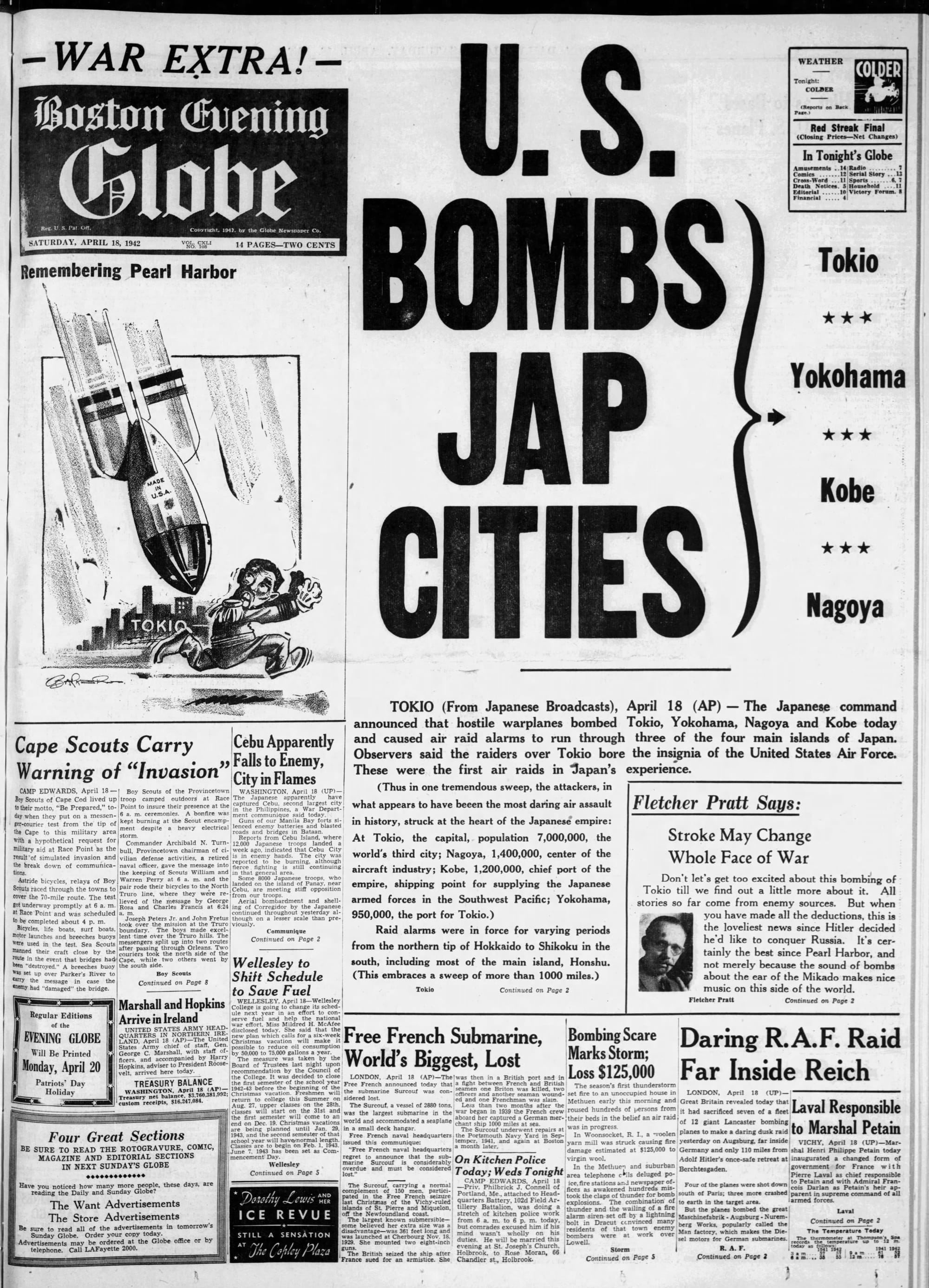 Today, April 18, 1942 we bombed Japan to retaliate for Pearl Harbor. I DIDN'T KNOW THIS. True, I suffer from a public school education but shouldn't this have ended it? Recall that Japan bombed us at Pearl Harbor so we would stay out of the Philippines, the Pacific and the war in general. But the opposite happened. We declared war and joined the allies just last December (1941). Are we hoping Japan will take a hint and drop out of the war while they're ahead? No. Because war is stupid and our leaders never learn. Okay, I apologize. I'm trying not to editorialize just keep track the war.