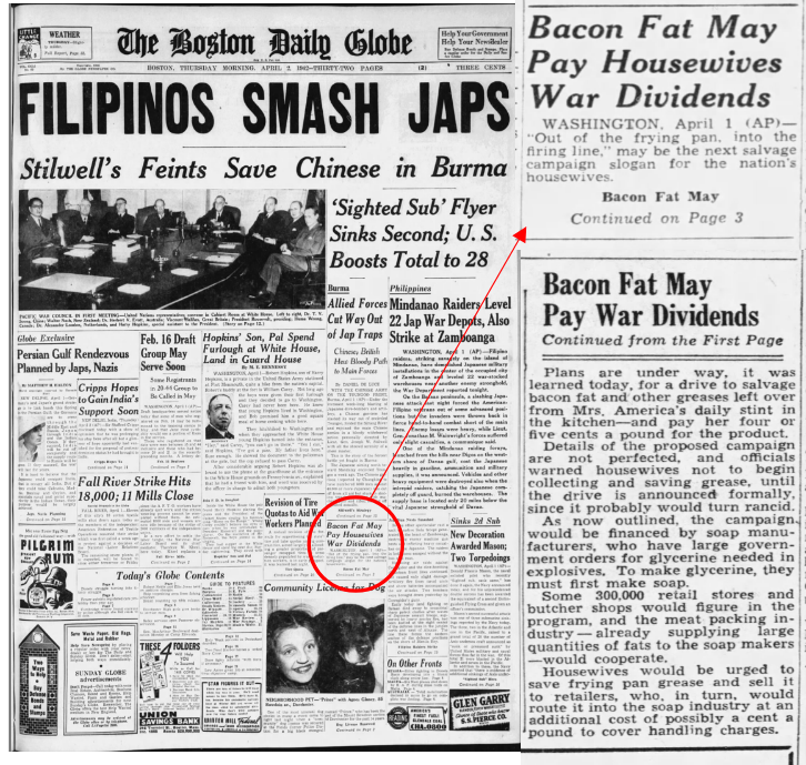 Did your mom or grandma have a grease can where they saved all types of cooking grease? My mom did and I never understood why until I started this research. It was a habit that started back in 1942. The military needed explosives and for that, they needed glycerin. To make glycerin you need to make soap and for that, you need grease. Yep, we beat the Nazis with bacon! People saved grease and turned it in almost anywhere for 4 or 5 cents a pound. That’s a lot of fried food.