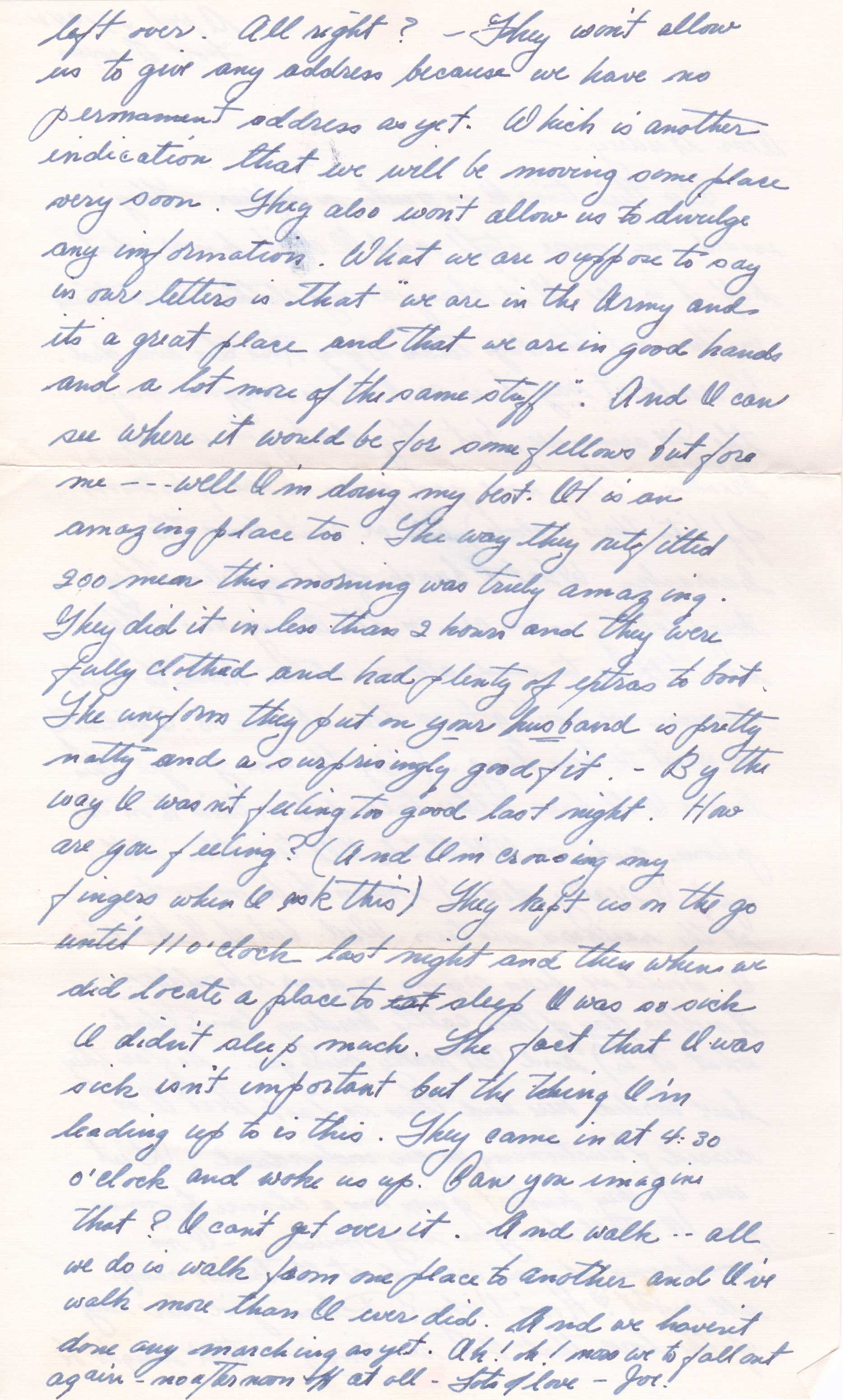 They kept us on the go until 11 o’clock last night and then when we did locate a place to sleep, I was so sick I didn’t sleep much. The fact that I was sick isn’t important but the thing I’m leading up to is this. They came in at 4:30 o’clock and woke us up. Can you imagine that? I can’t get over it. And walk… all we do is walk from one place to another and I’ve walked more than I ever did. And we haven’t done any marching as yet.