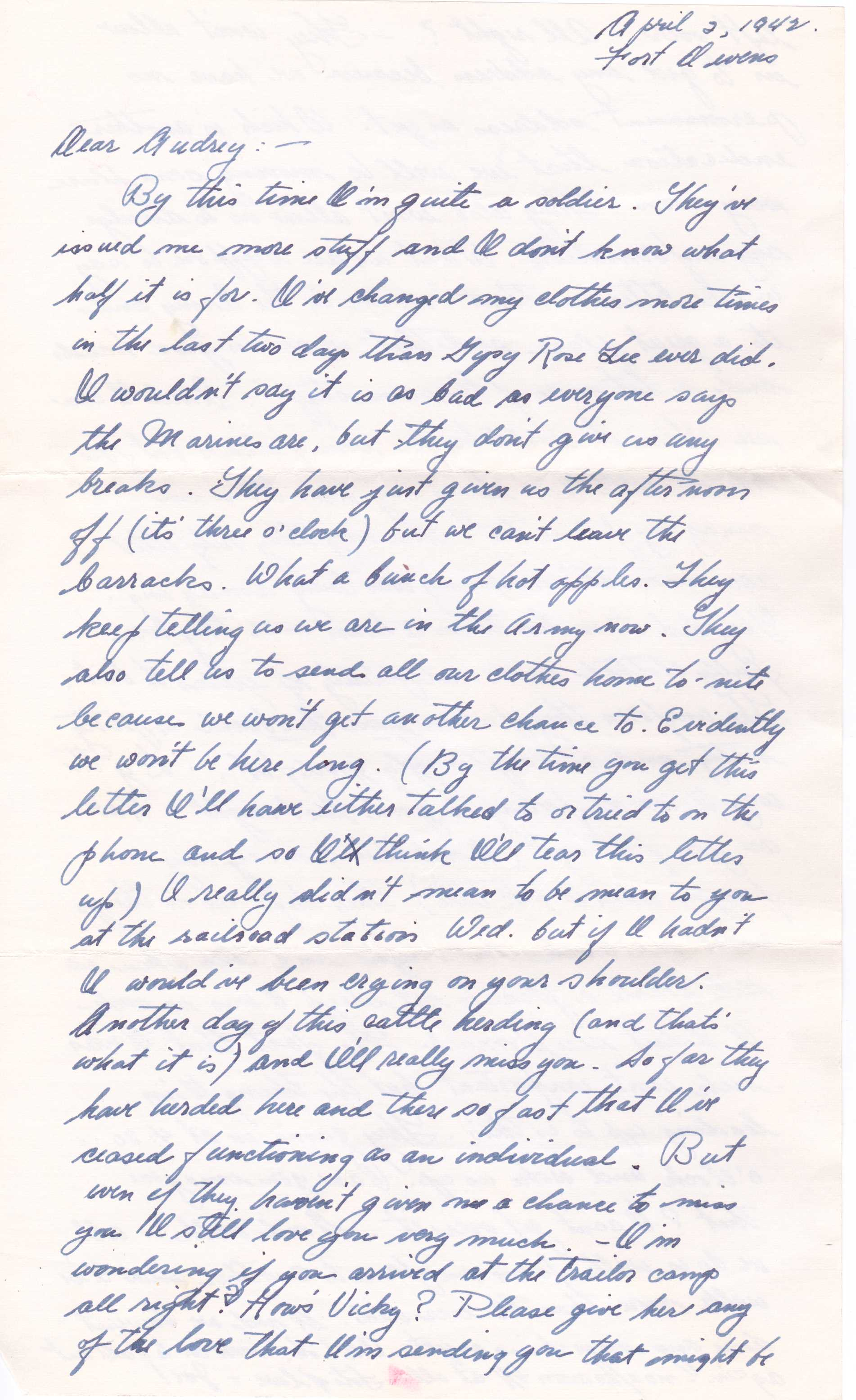 They keep telling us we are in the Army now. They also tell us to send all our clothes home to-nite because we won’t get another chance to. Evidently, we won’t be here long. (By the time you get this letter I'll have either talked to or tried to on the phone and so I think I'll tear this letter up) I really didn't mean to be mean to you at the railroad station Wed. but if I hadn’t I would’ve been crying on your shoulder.