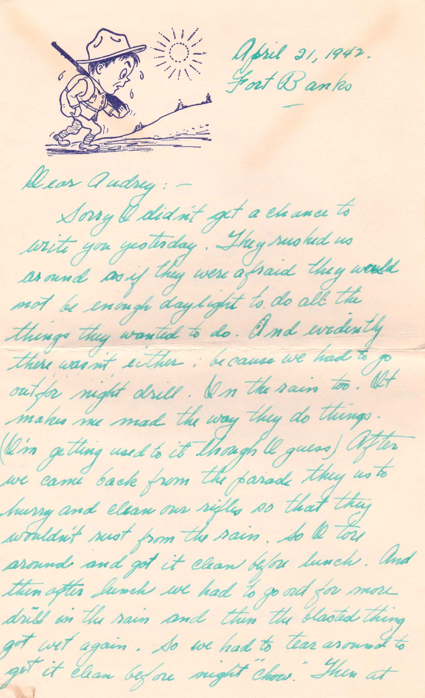 Sorry I didn't get a chance to write you yesterday. They rushed us around so if they were afraid they would not be enough daylight to do all the things they wanted to do. And evidently there weren't either because we had to go out for night drill, in the rain too. It makes me mad the way they do things. I'm getting used to it though I guess. After we came back from the parade they had us hurry and clean our rifles so that they wouldn't rust from the rain. So I turned around and got it clean before lunch, and then after lunch we had to go out for more drill in the rain and then the blasted thing got wet again. So we had to tear around to get it cleaned before night “chow”. Then at around … well after supper they get us out again and it was the same old story.