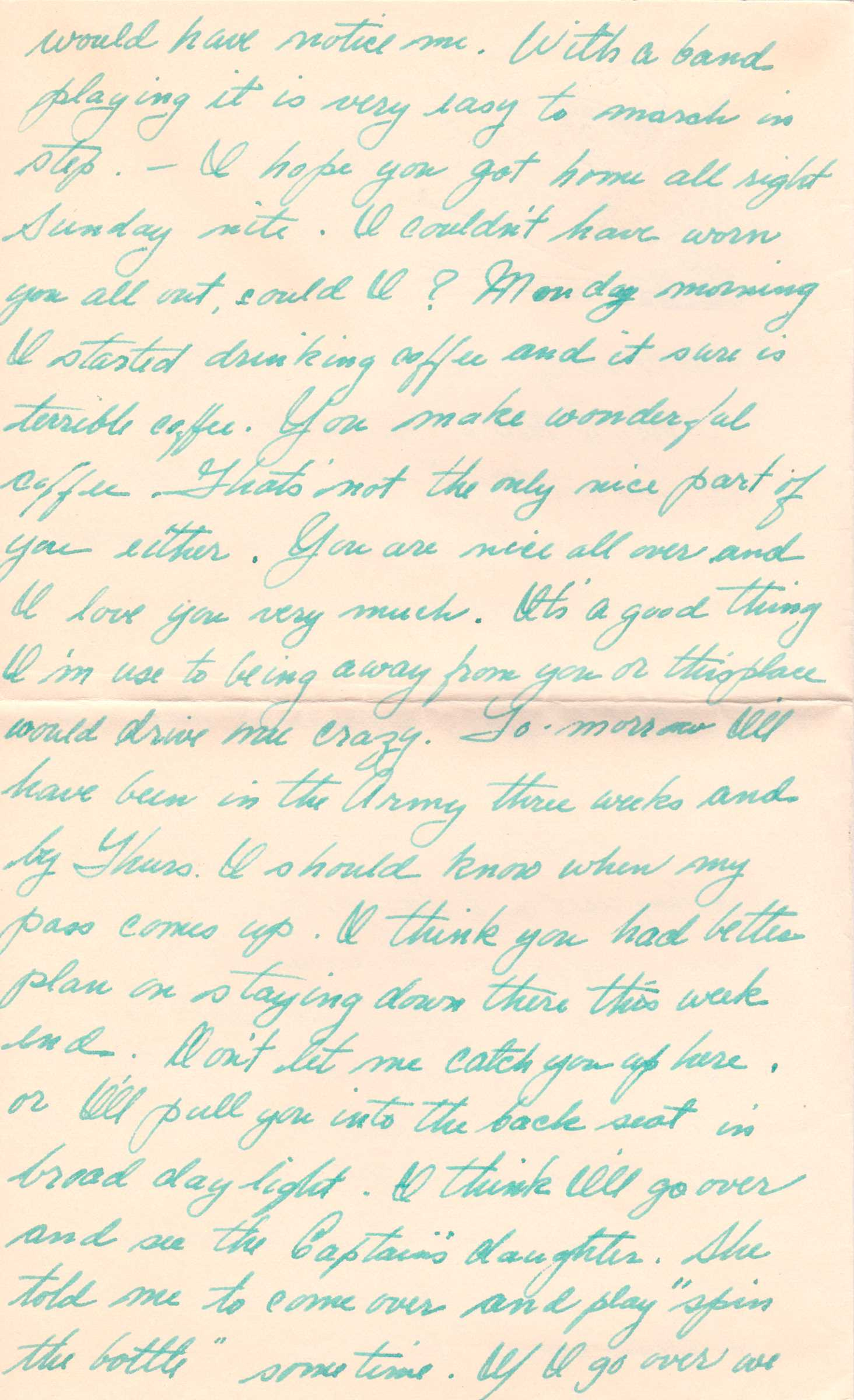 Monday morning, I started drinking coffee and it sure is terrible coffee. You make wonderful coffee. That's not the only nice part of you either. You are nice all over and I love you very much. It's a good thing I'm used to being away from you or this place would drive me crazy. Tomorrow I’ll have been in the Army 3 weeks and by Thursday I should know when my pass comes up.