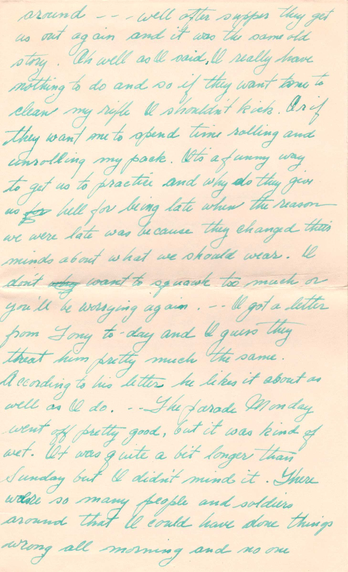 I've got a letter from Tony today and I guess they treat him pretty much the same. According to his letter, he likes it about as well as I do. The parade Monday went off pretty good, but it was kind of wet. It was quite a bit longer than Sunday but I didn't mind it. There were so many people and soldiers around I could have done things wrong all morning and no one would have noticed me. With the band playing it is very easy to march in step. I hope you got home all right Sunday night. I couldn't have worn you out, could I?