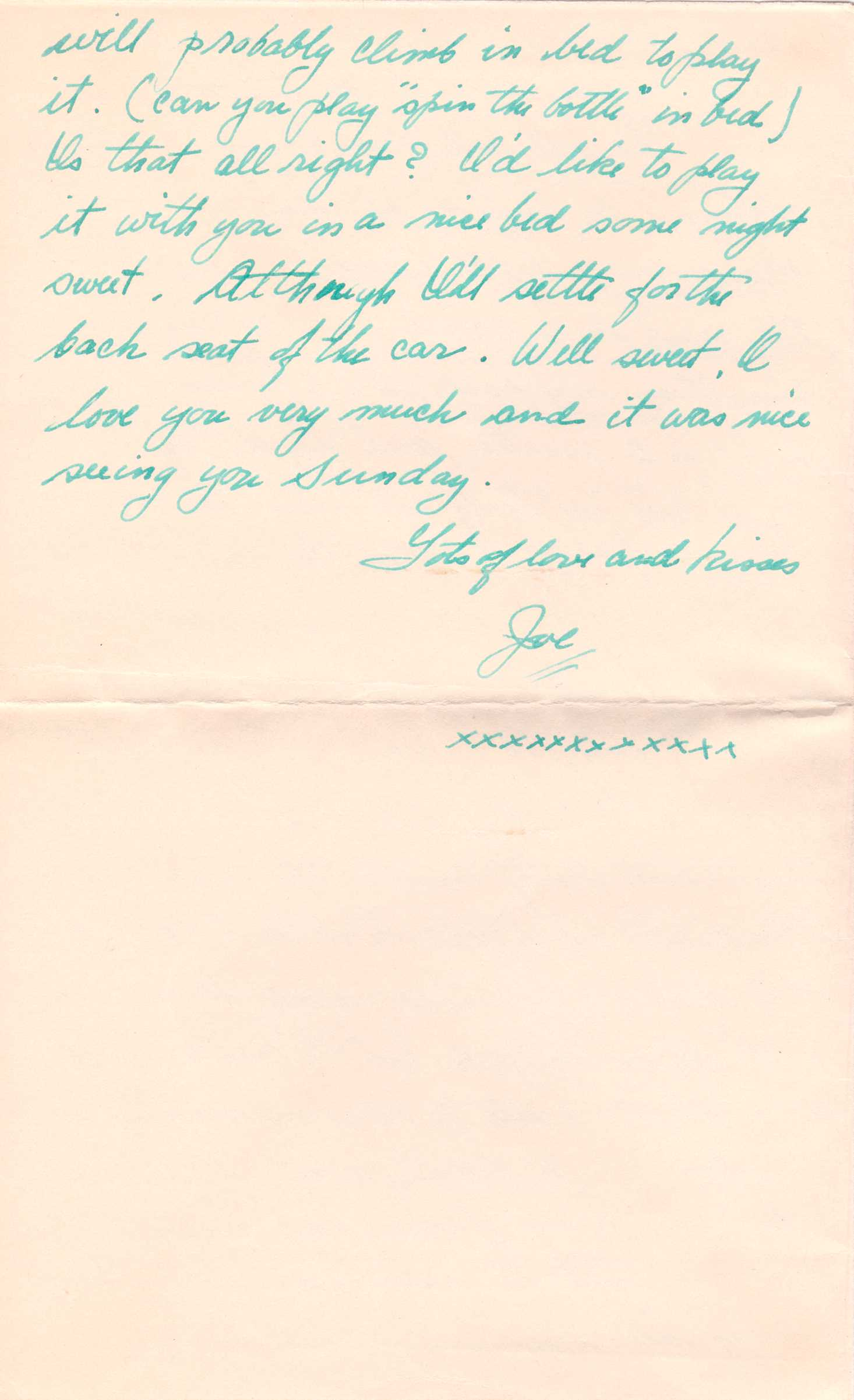 I think you had better plan on staying down there this weekend. Don't let me catch you up here or I'll pull you into the back seat in broad daylight. I think I’ll go over and see the Captain's daughter. She told me to come over and play “spin the bottle” sometime. If I go over, we will probably climb in bed to play it. (can you play spin the bottle in bed) is that all right? I'd like to play it with you in a nice bed some night sweet. Although I’ll settle for the backseat of the car.