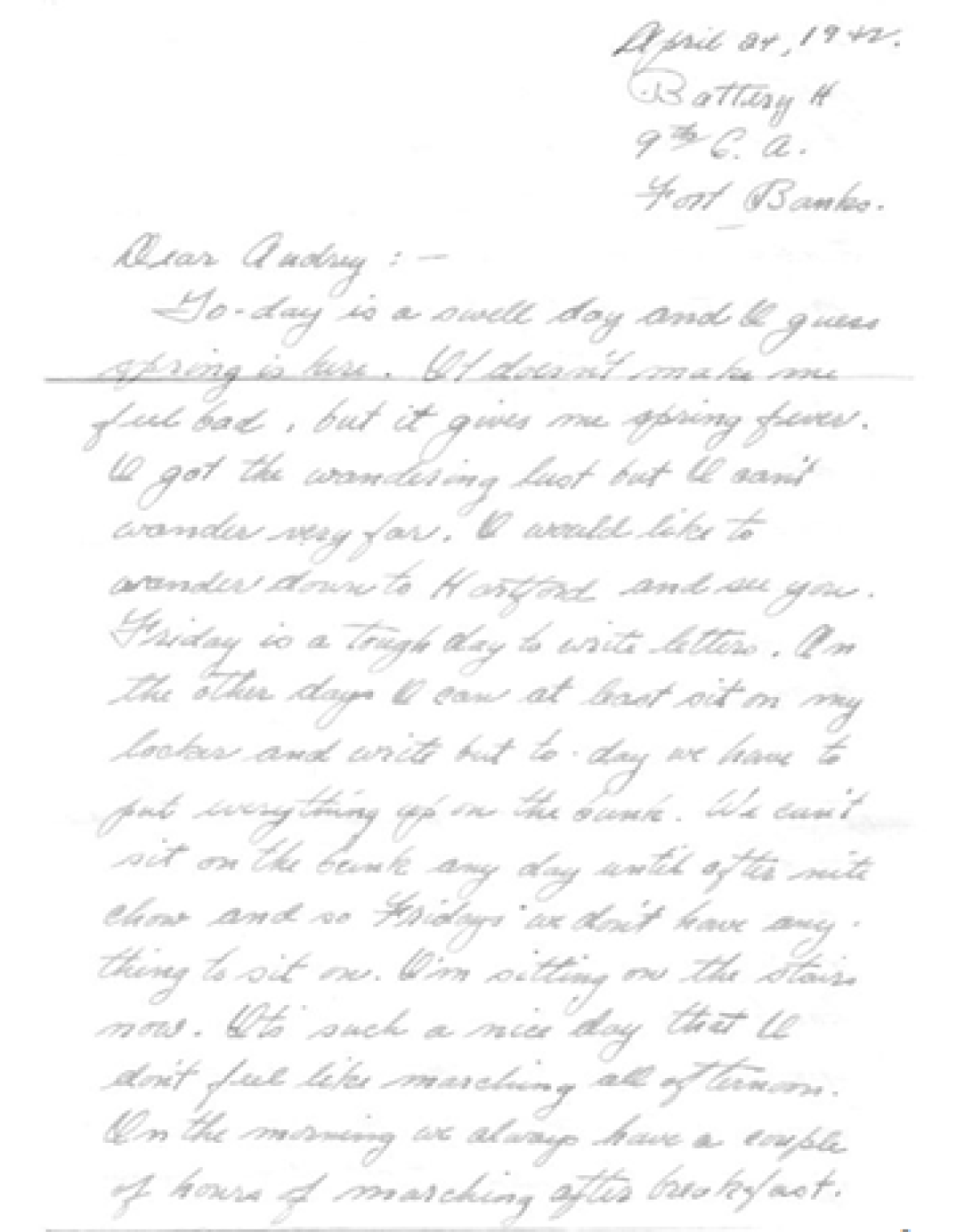 Today is a swell day and I guess spring is here. It doesn’t make me feel bad, but it gives me spring fever. I got the wandering lust but I can’t wander too far. I would like to wander down to Hartford and see you. Friday is a tough day to write letters. In the other days, I can at least sit on my locker and write but today we have to put everything up on the bunk. We can’t sit on the bunk any day until after nite chow and so Fridays we don’t have anything to sit on. I’m sitting on the stair now.