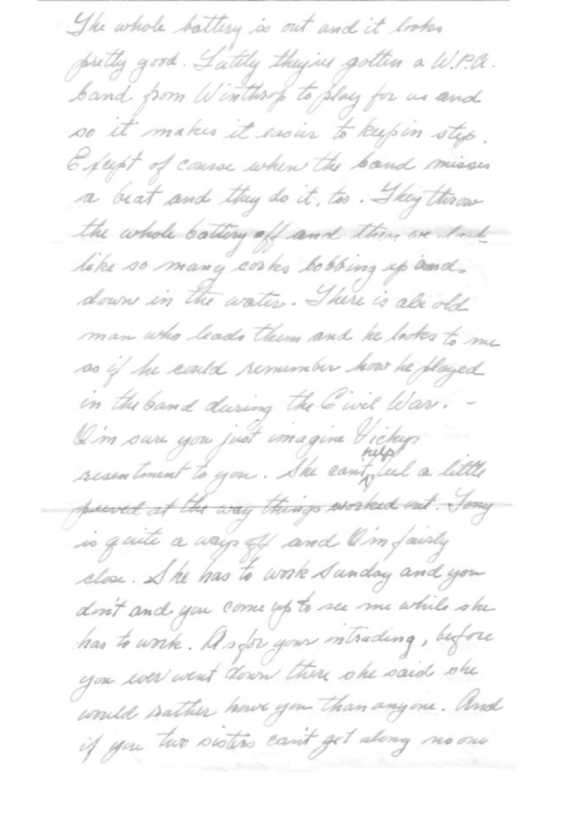It’s such a nice day that I don’t feel like marching all afternoon. In the morning we always have a couple of hours of marching after breakfast. The whole battery is out and it looks pretty good. Lately they’ve gotten a W.P.A. band from Winthrop to play for us and so it makes it easier to keep in step. Except of course when the band misses a beat and they do too. They throw the whole battery off and then we look like so many corks bobbing up and down in the water. There is an old man who leads them and he looks to me as if he could remember how he played in the band during the Civil War.