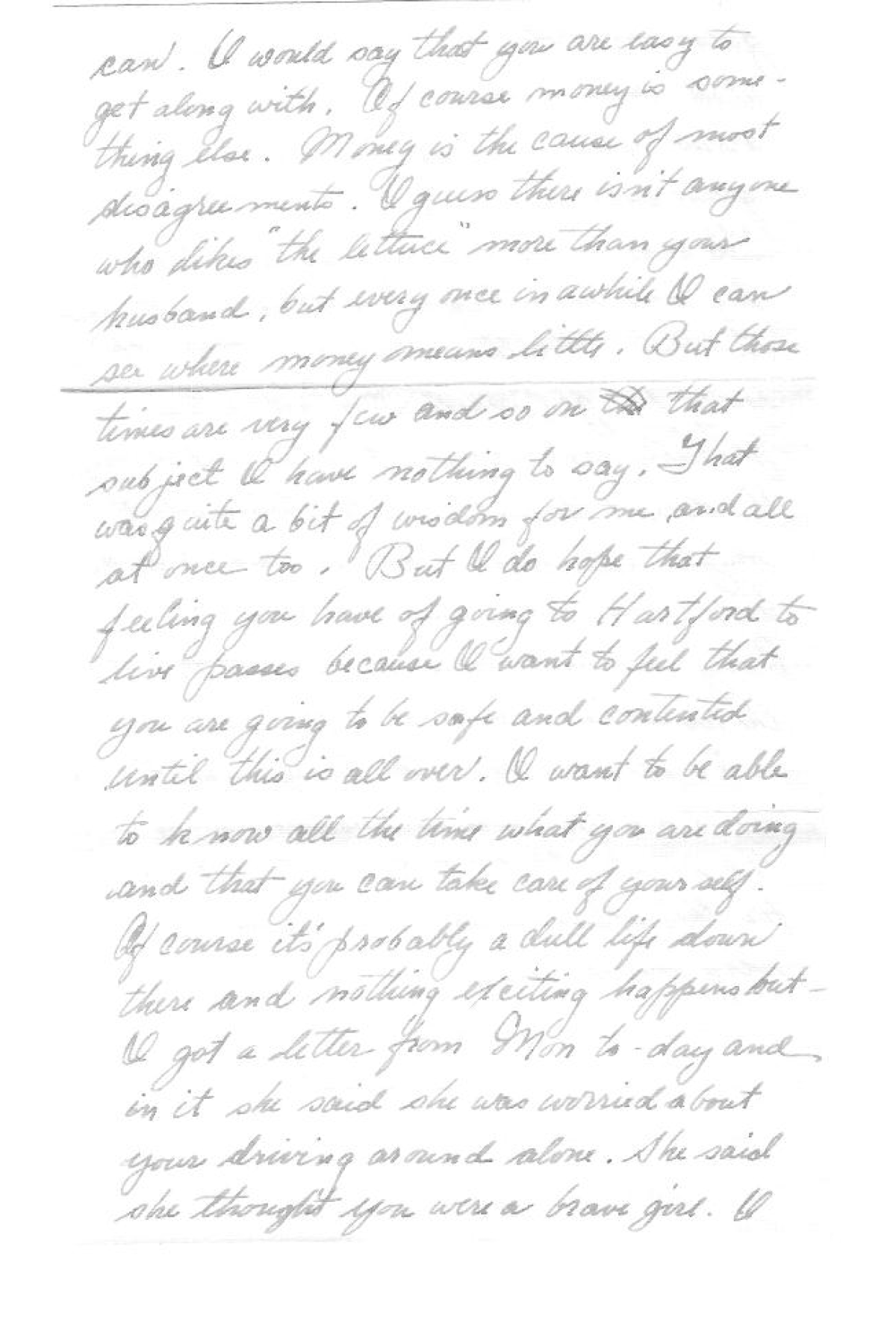 That was quite a bit of wisdom for me and all at once too. But I do hope that feeling you have of going to Hartford to live passes because I want to feel that you are going to be safe and contented until this is all over. I want to able to know all the time what you are doing and that you can take care of yourself. Of course, it’s probably a dull life down there and nothing exciting happens but I got a letter from Mom today and in it she said she was worried about your driving around alone. She said she thought you were a brave girl. I guess she wrote this before she came over Wed. and before you wrote and said you arrived safe.