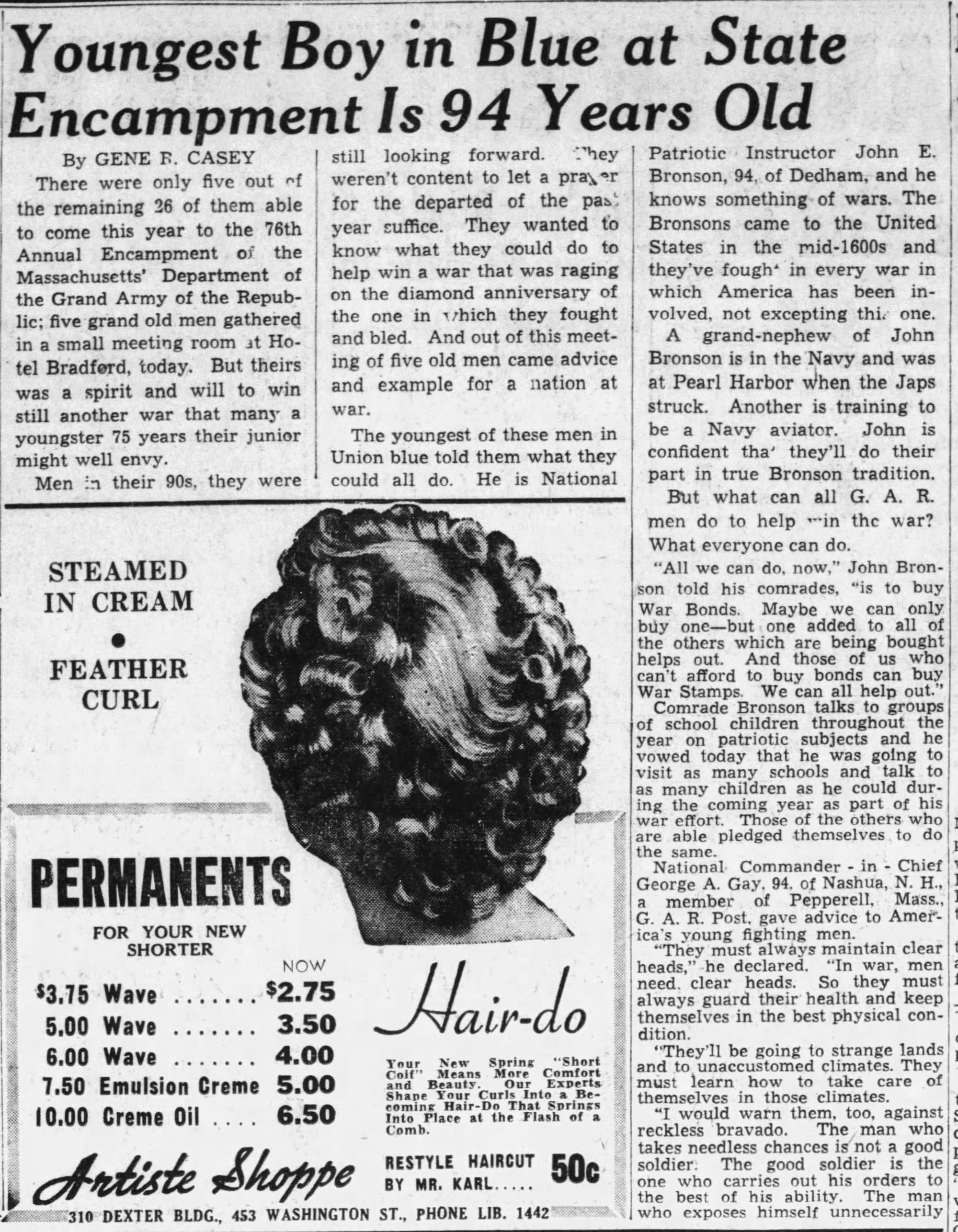 The young men of the G.A.R. - the only five remaining who wore the Union blue colors, describe ways they can help in the war effort and encourage others to help as well. Note: the Artistic Shoppe ad reminds me that Mom's sister, Emily has a hair salon in Boston. Not sure if she advertised but those are very reasonable prices, I think.
