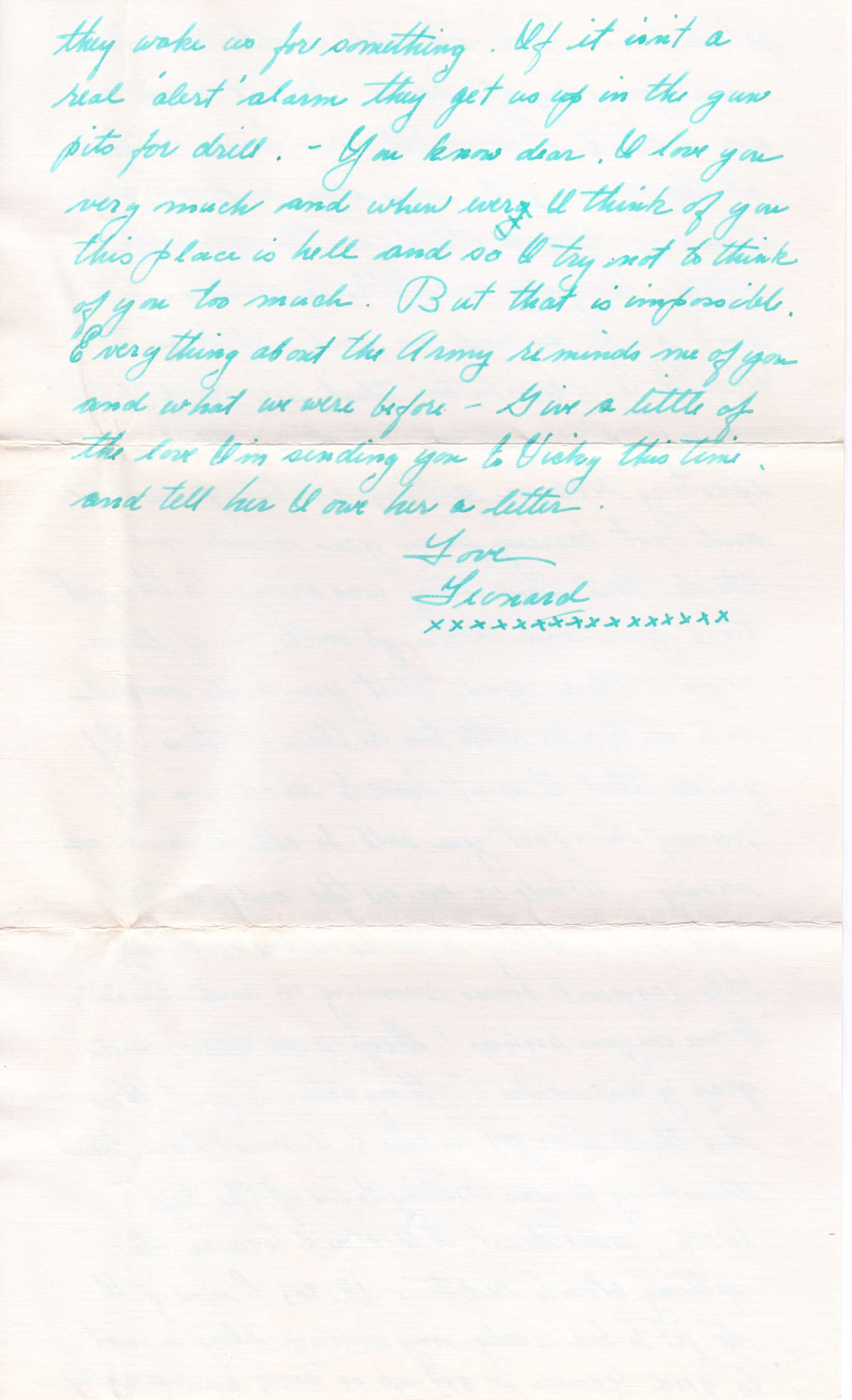 You know dear I love you very much and whenever I think of you this place is hell and so I try not to think of you too much. But that is impossible. Everything about the army reminds me of you and what we were before. Give a little love the love I'm sending to Vicky this time and tell her I owe her a letter.