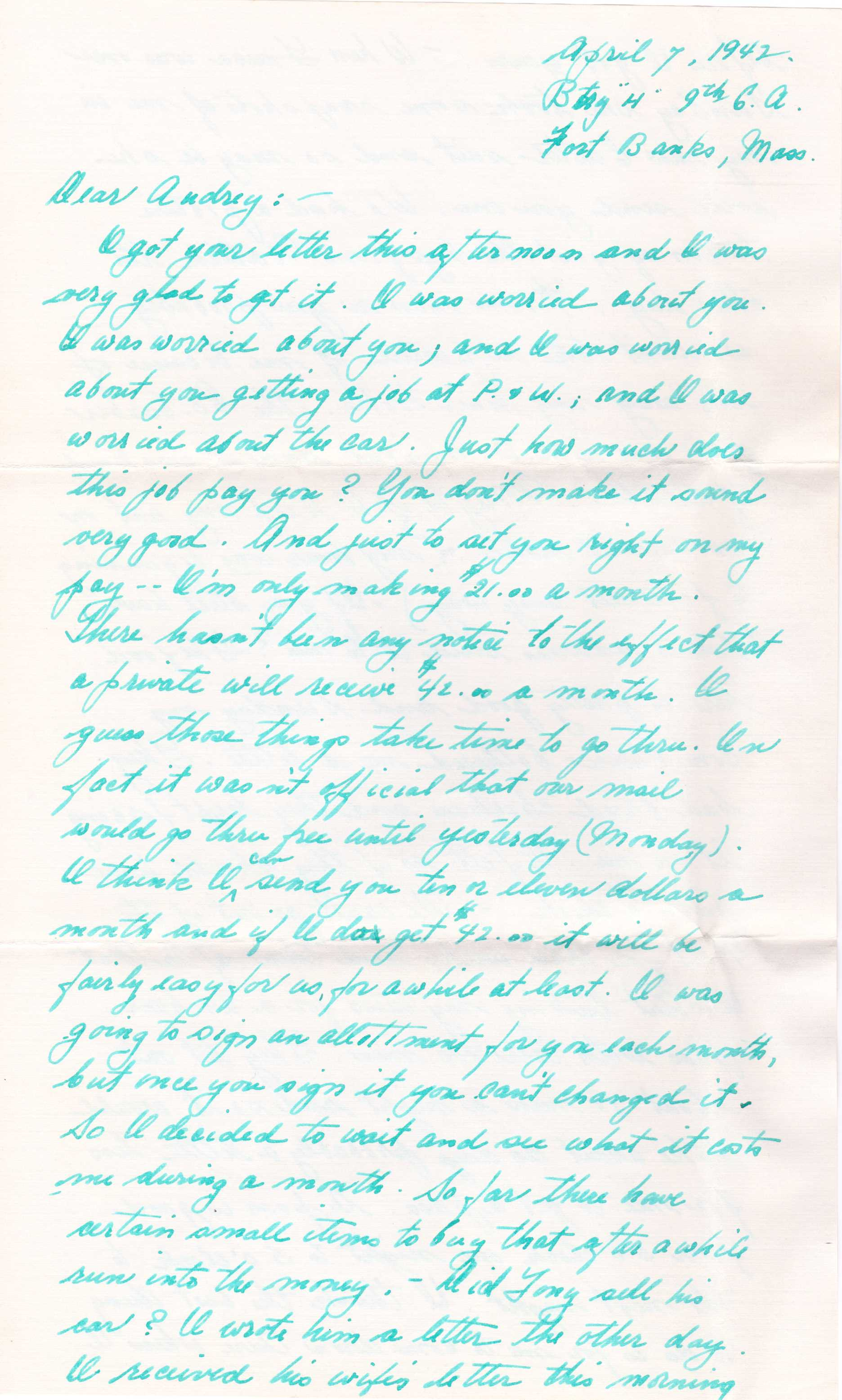 I got your letter this afternoon and I was very glad to get it. I was worried about you. I was worried about you, and I was worried about your getting a job at P & W and I was worried about the car. Just how much does this job pay you? You don't make it sound very good. And just to set you right on my pay, I'm only making $21 a month. There hasn't been any notice to the effect that a private will receive $42 a month. I guess those things take time to go through. In fact it wasn’t official that our mail would go thru free until yesterday (Monday).