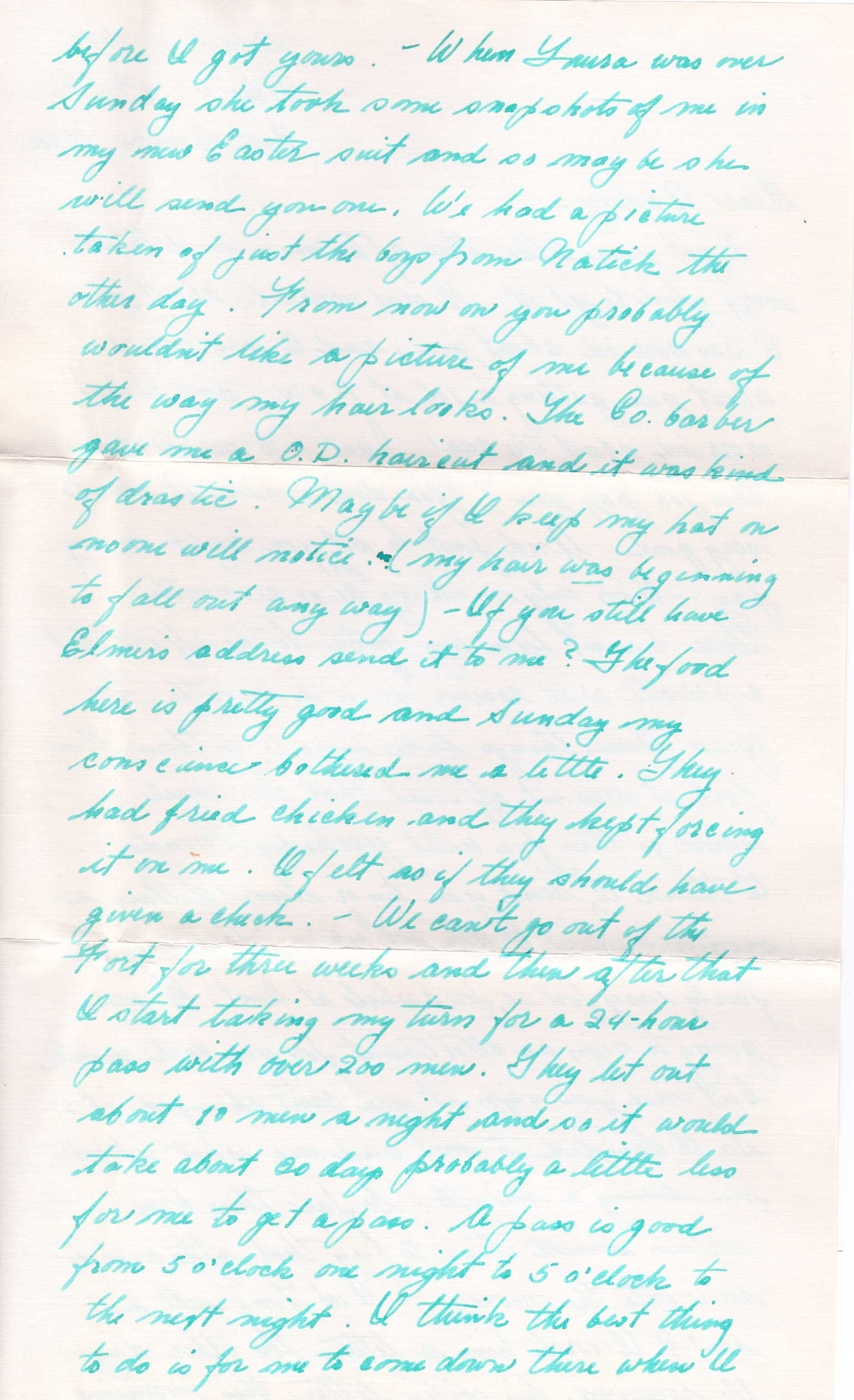 Did Tony sell his car? I wrote him a letter the other day. I received his wife's letter this morning before I got yours. When Laura was over Sunday she took some snapshots of me in my new Easter suit and so maybe she will send you one. We had picture taken of just the boys from Natick the other day. From now on you probably wouldn't like a picture of me because of the way my hair looks. The company barber gave me a G.D. haircut and it was kind of drastic. Maybe if I keep my hat on no one will notice (my hair was beginning to fall out anyway).