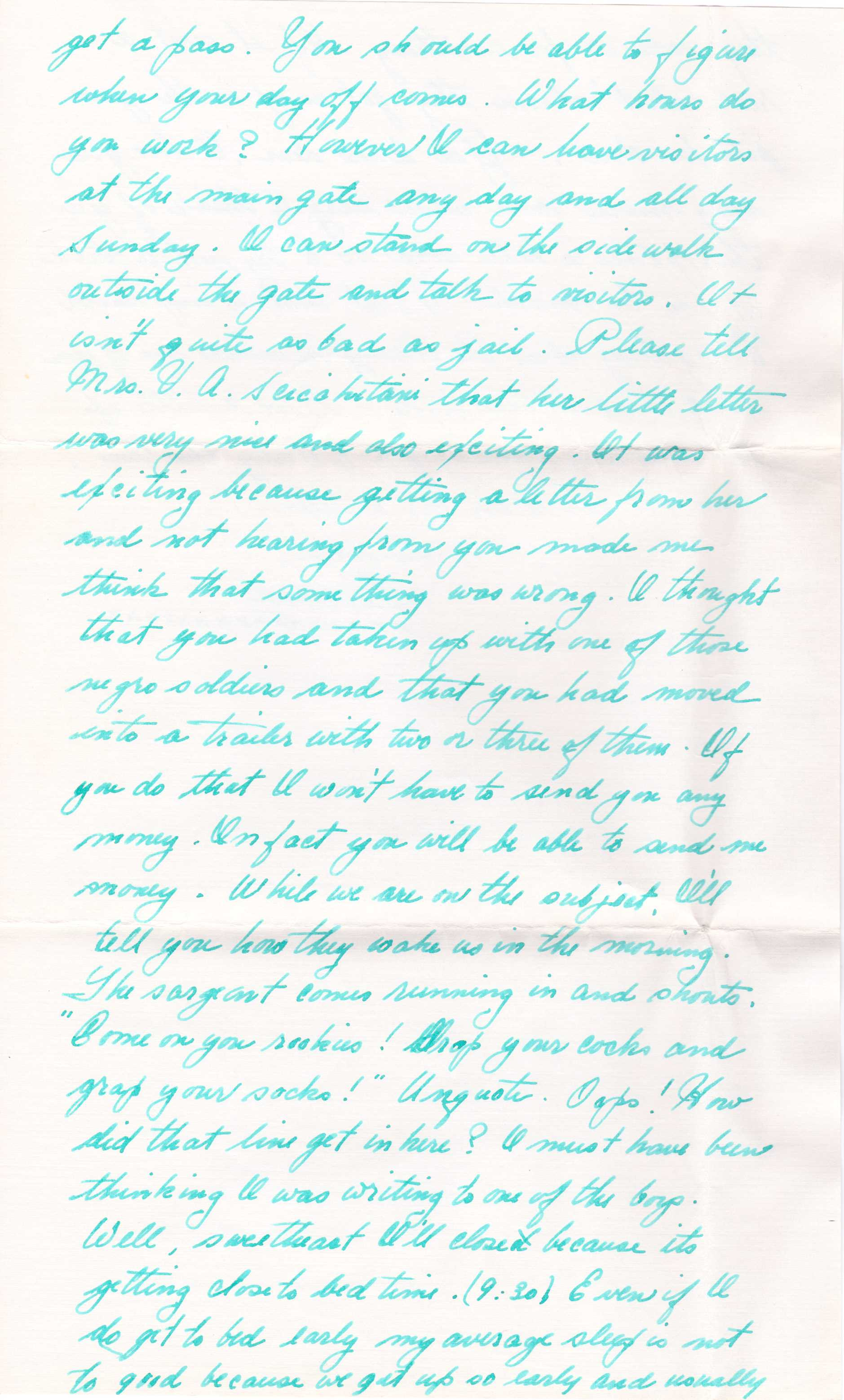 Please tell Mrs. V.A. Sercolutani that her little letter was very nice and also exciting. It was exciting because getting a letter from her and not hearing from you made me think that something was wrong. I thought that you had taken up with one of those negro soldiers and that you had moved into a trailer with two or three of them. If you do that, I won't have to send you any money. In fact, you will be able to send me money.