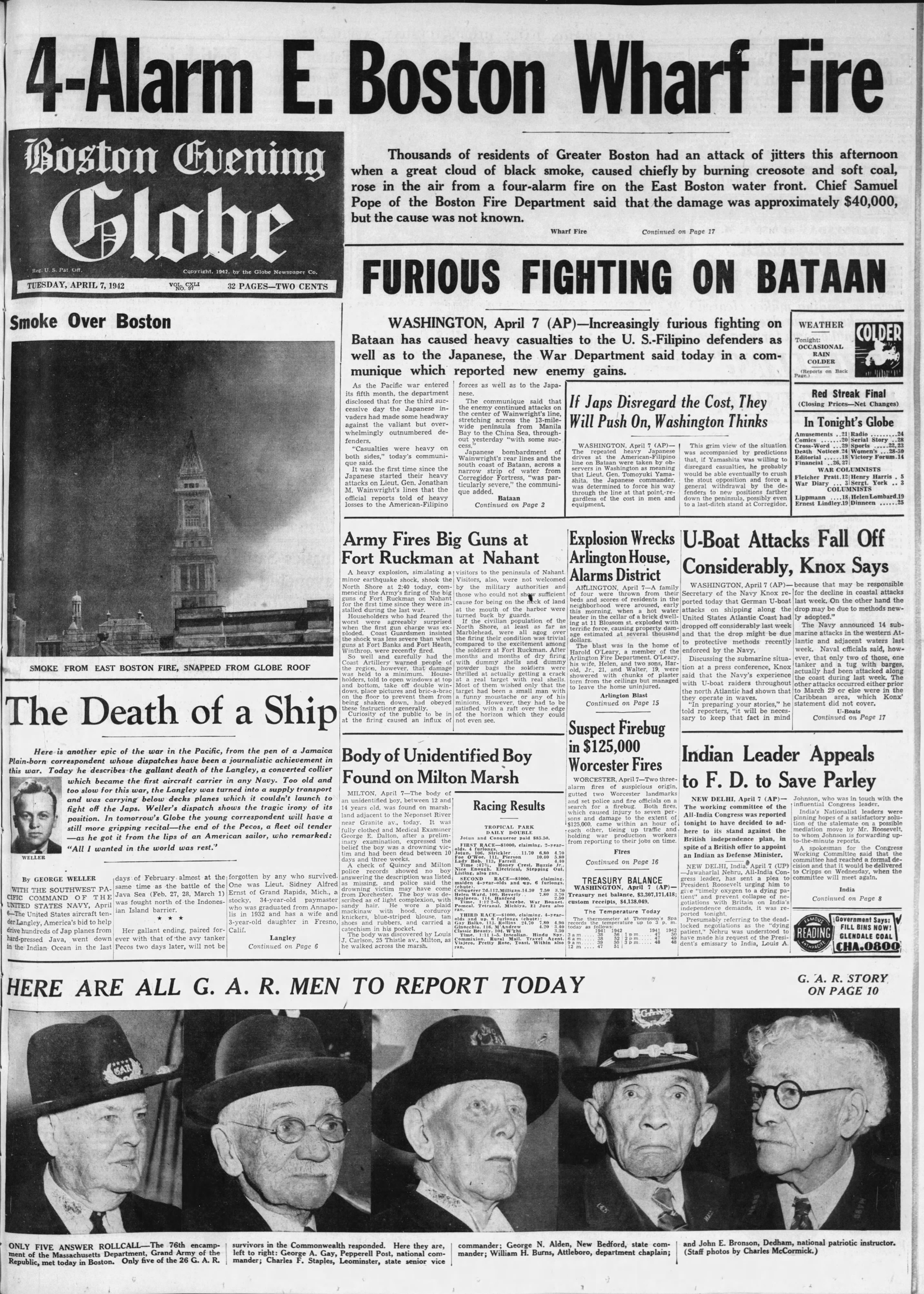 I continue to be impressed with the level of detail the Boston Globe writers provide. There seems to be a lot of fires in Boston. A terrible 5-alarm fire breaks out and the smoke darkens the sky meanwhile the the fighting and the war marches on. At the bottom, those G.A.R. men are veterans of the Civil War! Yes, that Civil War!