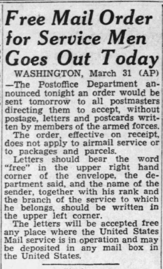 He promises to write everyday and boy howdy; he pretty much does - mostly with green ink. That’s how you communicated back then, you wrote a letter. Green ink simply meant you got a good deal on the bottle. The cost of a stamp is only 3¢. You have to have your own paper, envelopes, and something to write with but service members won’t need postage. What luck! The free mail for service members goes into effect on April 1, 1942. It does cost Mom to write, 3 cents per stamp plus.