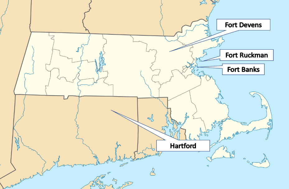 This will be the first base Dad is sent to. Located in Winthrop, Massachusetts it's right next to Boston. It is part of Harbor Defense for Boston so giant guns pointed at the ocean and soldiers patrolling the beaches. This is an older map but usable for 1942.