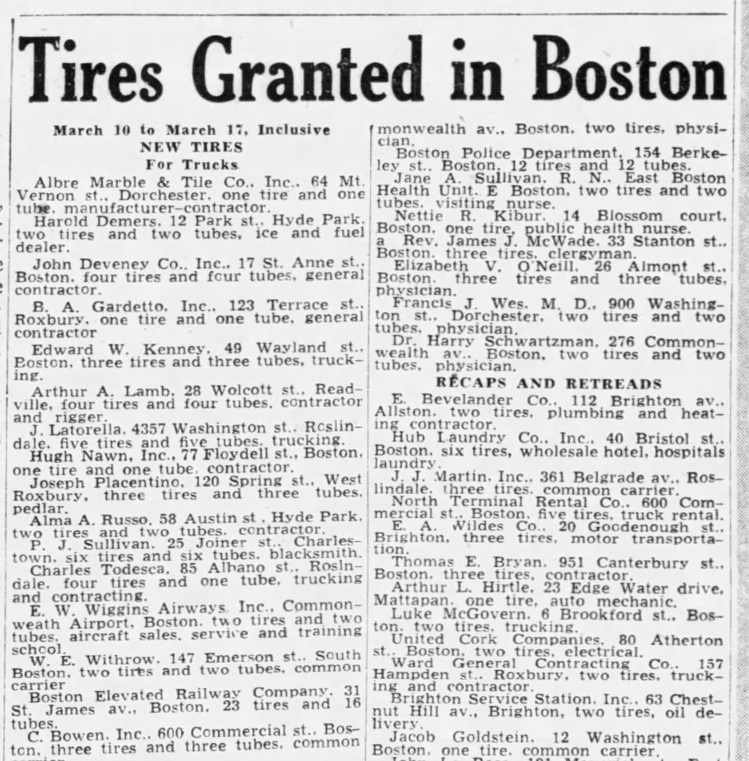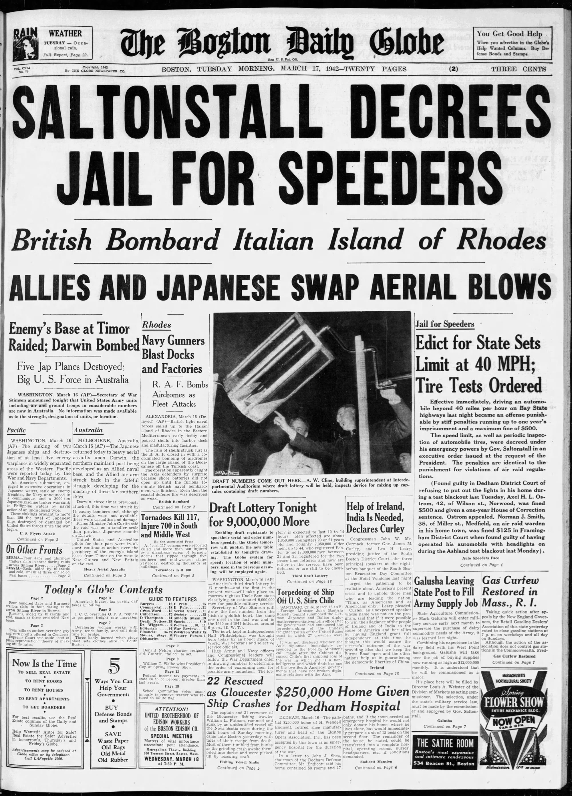 Ok, rarebit looks really good. Especially with Guinness. War continues to rage so St. Patrick's Day might be a bit more low-key. There will be a parade because this is Boston - I can share that tomorrow. In the meantime, Massachusetts Governor Saltonstall has decreed a 40mph speed limit for all highways in order to save gas. Pretty hefty fine of up to a year in jail and max $500. Gas rationing is in effect. In addition - no bald tires. Keep scrolling for more on tires, Dedham, and the lottery.
