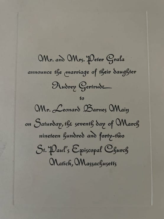 On this day in 1942, my dad and mom: Leonard (Joe) Barnes Main and Audrey Gertrude Grala got married. It was a small, quiet ceremony at the church across the street from Joe’s family home in Natick, Massachusetts. That’s where they prepared for the big event. It was actually a simple ceremony and dinner with the family.